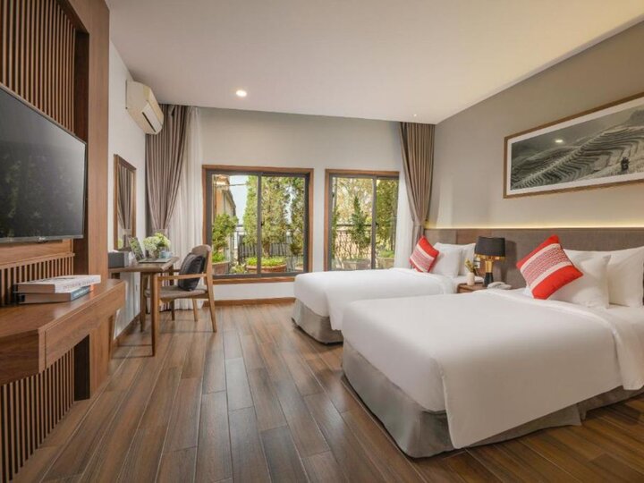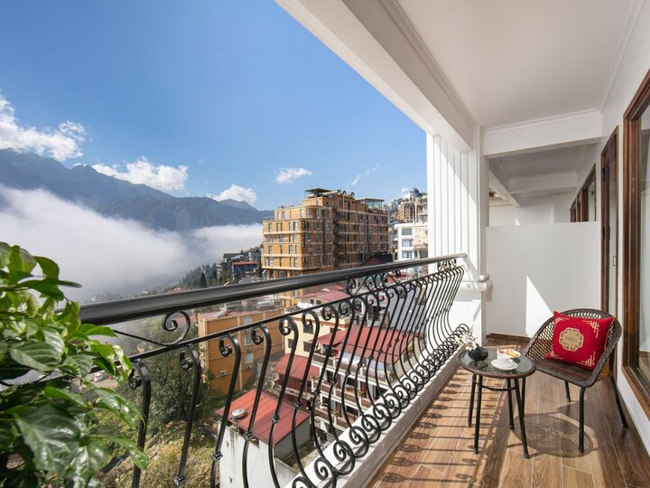 Deluxe rộng 35-40m², có ban công riêng nhìn ra núi Hoàng Liên hoặc phố trung tâm. Buổi sáng chỉ cần kéo rèm là có thể ngắm bình minh phủ sương, buổi tối ngồi dựa ghế đọc sách giữa làn gió se lạnh đặc trưng của Sapa. Đây là hạng phòng phổ biến nhất vì cân bằng tốt giữa giá và trải nghiệm.