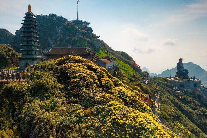 Không chỉ mãn nhãn trước sắc hoa đỗ quyên rực rỡ, du khách còn có cơ hội trải nghiệm văn hóa và tâm linh như chiêm bái Đại tượng Phật A Di Đà – Tượng phật bằng đồng tọa lạc ở độ cao cao nhất châu Á, tham quan quần thể tâm linh kỳ vĩ, ghé tượng Quan Thế Âm Bồ Tát thanh tịnh giữa trời mây. Hành trình chạm tay vào cột mốc 3.143 m, tham gia nghi thức thượng cờ trang nghiêm trên “nóc nhà Đông Dương” cũng sẽ để lại những kỉ niệm khó quên với du khách.