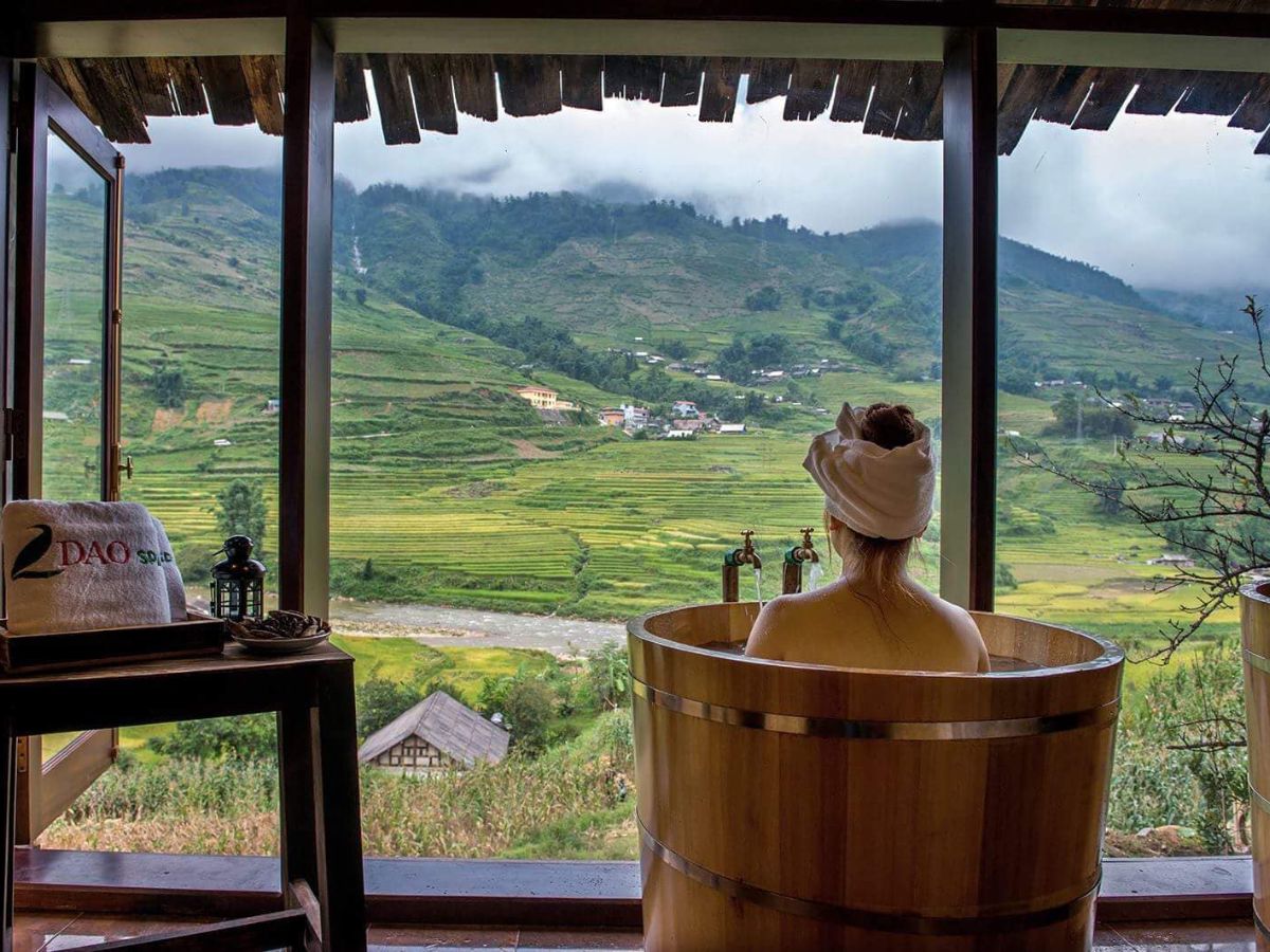 Ngâm mình trong nước tắm lá thuốc Dao đỏ và tận hưởng toàn cảnh Sa Pa. (Nguồn: Sưu tầm)