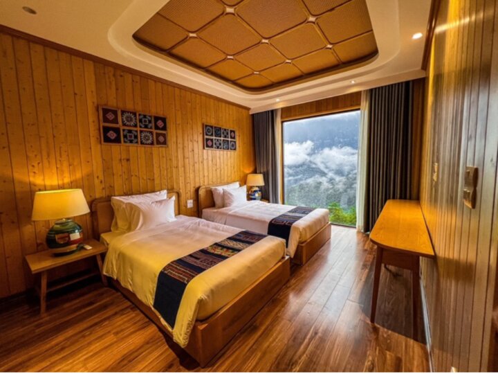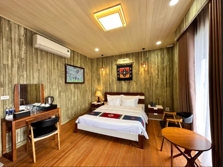 Nội thất phòng nghỉ được chăm chút tỉ mỉ với tông màu gỗ ấm cùng hoạ tiết thổ cẩm truyền thống. Mỗi căn phòng đều có những chi tiết trang trí tinh tế lấy cảm hứng từ văn hóa dân tộc. Điều này tạo nên không gian sinh động, giúp du khách cảm nhận được linh hồn của vùng đất Tây Bắc ngay trong căn phòng của mình.