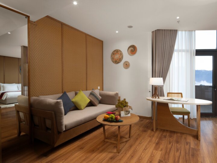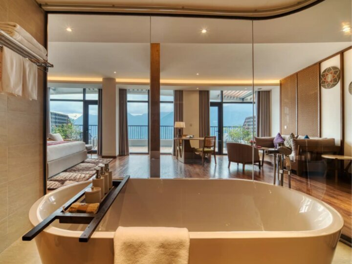 Không gian Suite đẳng cấp với phòng ngủ rộng rãi, phòng sinh hoạt riêng tư và phòng tắm hiện đại tích hợp bồn tắm thư giãn, là lựa chọn lý tưởng cho những ai tìm kiếm sự tinh tế, thoải mái và riêng biệt giữa thiên nhiên tuyệt mỹ.