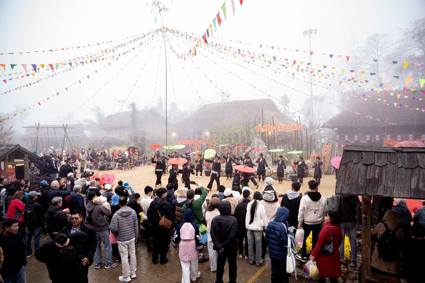 Tâm điểm thu hút đông đảo du khách nhất Hội Xuân Mở Cổng trời 2026 chính là Bản Mây, nơi du khách được hòa mình vào dòng chảy văn hóa Tây Bắc sống động với chuỗi lễ hội truyền thống được tái hiện công phu. Lễ hội Gàu Tào của người Mông (từ mùng 3 đến mùng 5 Tết) mở màn cho chuỗi hội hè với nghi thức dựng cây nêu độc đáo và các bài cúng khấn trang nghiêm cầu cho mùa màng bội thu.