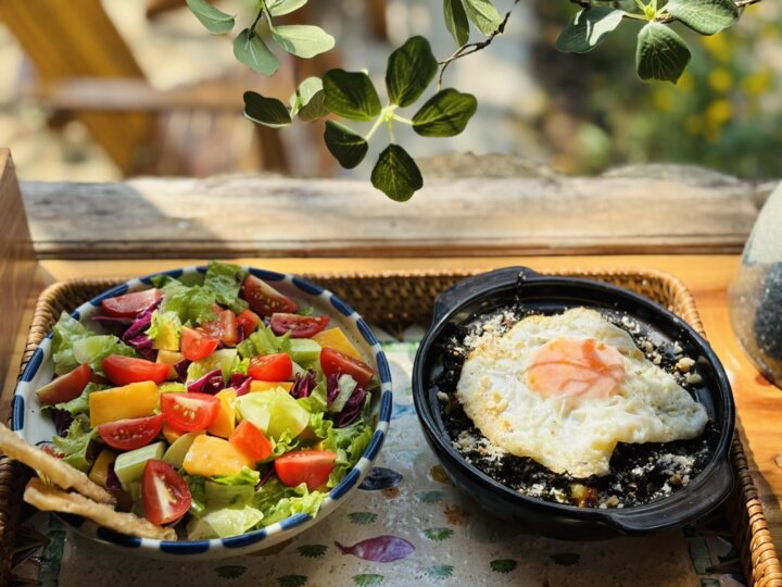 Không gian quán mang đến cảm giác ấm áp, thân thuộc, như đang dùng bữa tại nhà một người bạn. Từ cửa sổ, bạn có thể ngắm nhìn những thửa ruộng bậc thang xanh mướt, khiến trải nghiệm ẩm thực cũng từ đó mà thêm phần thú vị. Nhiều du khách còn mê mẩn với món nổi tiếng của Tree Vegan Kitchen là cà tím nướng thơm lừng với hương vị vô cùng đậm đà.
